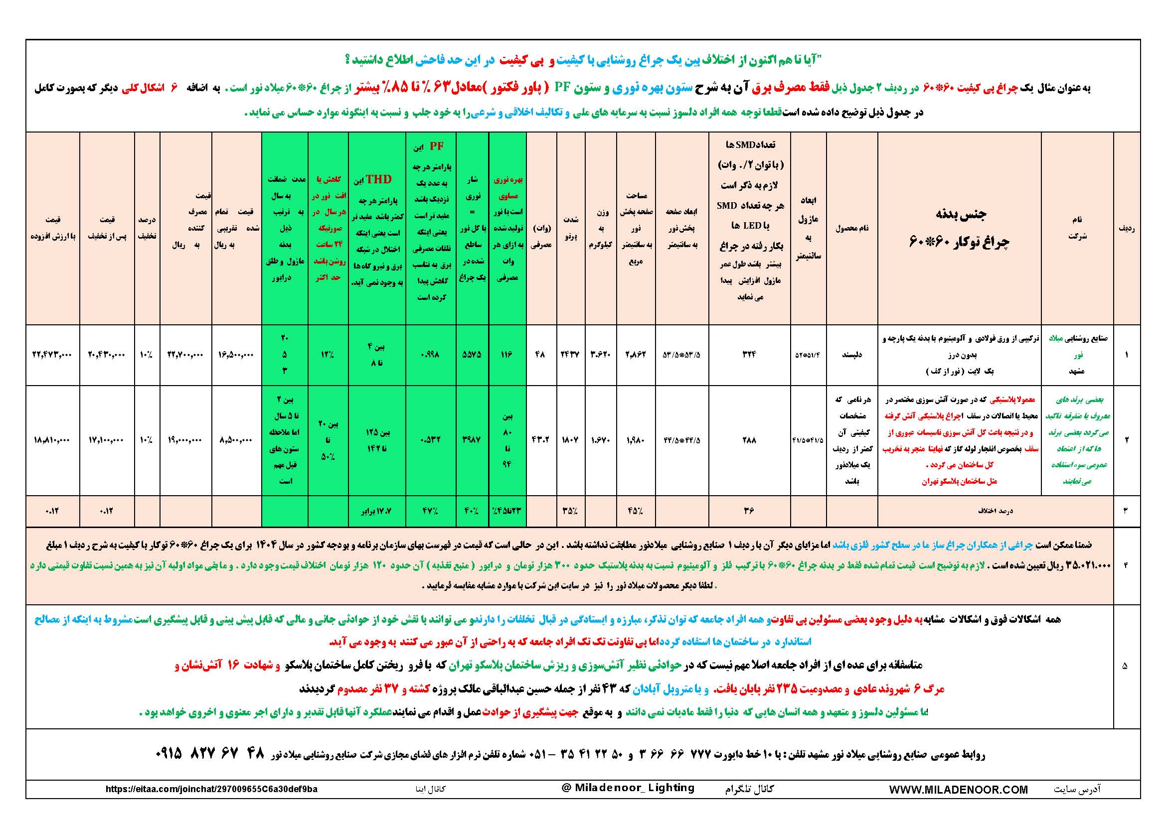 تفاوت مصرفی یک چراغ یا پنل ال ای دی LED با کیفیت و بی کیفیت بصورت جدولی در یک نگاه